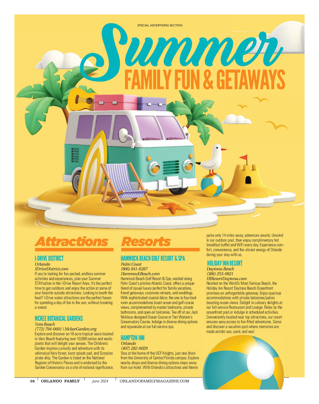 OFM_SummerFamilyGetaway_SAS_6_24_SAS 5 / 14 / 24 1 : 18 PM Page 1 SPECIAL ADVERTISING SECTION FAMILY FUN & GETAWAYS parks only 14 miles away , adventure awaits . Unwind in our outdoor pool , then enjoy complimentary hot Attractions Resorts breakfast buffet and WiFi every day . Experience com - fort , convenience , and the vibrant energy of Orlando during your stay with us . I - DRIVE DISTRICT HAMMOCK BEACH GOLF RESORT & SPA Orlando Palm Coast HOLIDAY INN RESORT IDriveDistrict.com ( 866 ) 841 - 0287 Daytona Beach If you’re looking for fun - packed , endless summer HammockBeach.com ( 386 ) 255 - 0921 activities and experiences , plan your Summer Hammock Beach Golf Resort & Spa , nestled along HIResortDaytona.com STAYcation in the I - Drive Resort Area . It’s the perfect Palm Coast's pristine Atlantic Coast , offers a unique Nestled on the World’s Most Famous Beach , the time to get outdoors and enjoy the action at some of blend of casual luxury perfect for family vacations , Holiday Inn Resort Daytona Beach Oceanfront your favorite outside attractions . Looking to beath the friend getaways , corporate retreats , and weddings . promises an unforgettable getaway . Enjoy spacious heat ? I - Drive water attractions are the perfect haven With sophisticated coastal décor , the one to four - bed - accommodations with private balconies / patios for spending a day of fun in the sun , without breaking room accommodations boast ocean and golf course boasting ocean views . Delight in culinary delights at a sweat . views , complemented by master bedrooms , private our full - service Restaurant and Lounge . Relax by the bathrooms , and open - air balconies . Tee off at our Jack oceanfront pool or indulge in scheduled activities . Nicklaus - designed Ocean Course or Tom Watson's Conveniently located near top attractions , our resort MCKEE BOTANICAL GARDENS ConservatoryCourse . Indulge in diverse dining options ensures easy access to fun - filled adventures . Come Vero Beach and rejuvenate at our full - service spa . and discover a vacation spot where memories are ( 772 ) 794 - 0601 | MckeeGarden.org made amidst sun , sand , and sea ! Explore and discover an 18 - acre tropical oasis located in Vero Beach featuring over 10,000 native and exotic HAMPTON INN plants that will delight your senses . The Children’s Orlando Garden inspires curiosity and adventure with its ( 407 ) 282 - 0029 whimsical fairy forest , karst splash pad , and Scorpion Stay at the home of the UCF Knights , just one block pirate ship . The Garden is listed on the National from the University of Central Florida campus . Explore Register of Historic Places and is endorsed by the nearby shops and diverse dining options steps away Garden Conservancy as a site of national significance . from our hotel . With Orlando's attractions and theme 28 ORLANDO FAMILY june 2024 ORLANDOFAMILYMAGAZINE.COM