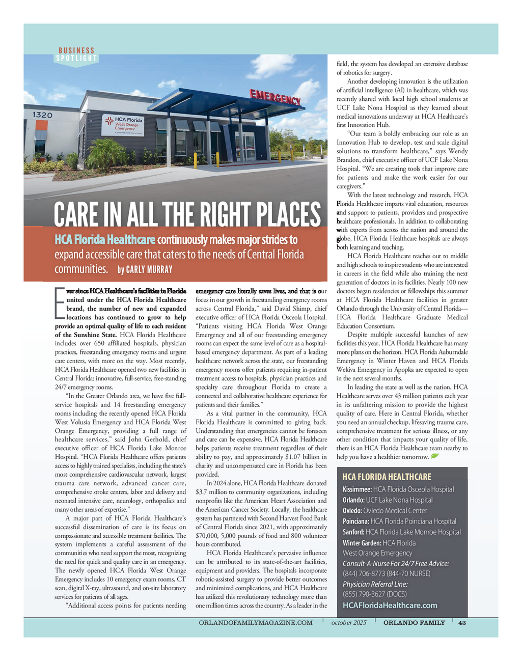 OFM_HCA profile_1025 - edit_Profile 9 / 9 / 25 4 : 53 PM Page 1 B U S I N E S S S P O T L I G H T field , the system has developed an extensive database of robotics for surgery . Another developing innovation is the utilization of artificial intelligence ( AI ) in healthcare , which was recently shared with local high school students at UCF Lake Nona Hospital as they learned about medical innovations underway at HCA Healthcare’s first Innovation Hub . “ Our team is boldly embracing our role as an Innovation Hub to develop , test and scale digital solutions to transform healthcare , ” says Wendy Brandon , chief executive officer of UCF Lake Nona Hospital . “ We are creating tools that improve care for patients and make the work easier for our caregivers . ” With the latest technology and research , HCA Florida Healthcare imparts vital education , resources and support to patients , providers and prospective healthcare professionals . In addition to collaborating CARE IN ALL THE RIGHT PLACES with experts from across the nation and around the globe , HCA Florida Healthcare hospitals are always HCA Florida Healthcare continuously makes major strides to both learning and teaching . HCA Florida Healthcare reaches out to middle expand accessible care that caters to the needs of Central Florida and high schools to inspire students who are interested communities . by CARLY MURRAY in careers in the field while also training the next generation of doctors in its facilities . Nearly 100 new ver since HCA Healthcare’s facilities in Florida emergency care literally saves lives , and that is our doctors began residencies or fellowships this summer united under the HCA Florida Healthcare focus in our growth in freestanding emergency rooms at HCA Florida Healthcare facilities in greater brand , the number of new and expanded across Central Florida , ” said David Shimp , chief Orlandothrough the University of Central Florida — Elocations has continued to grow to help executive officer of HCA Florida Osceola Hospital . HCA Florida Healthcare Graduate Medical provide an optimal quality of life to each resident “ Patients visiting HCA Florida West Orange EducationConsortium . of the Sunshine State . HCA Florida Healthcare Emergency and all of our freestanding emergency Despite multiple successful launches of new includes over 650 affiliated hospitals , physician rooms can expect the same level of care as a hospital - facilities this year , HCA Florida Healthcare has many practices , freestanding emergency rooms and urgent based emergency department . As part of a leading moreplans on the horizon . HCA Florida Auburndale care centers , with more on the way . Most recently , healthcare network across the state , our freestanding Emergency in Winter Haven and HCA Florida HCA Florida Healthcare opened two new facilities in emergency rooms offer patients requiring in - patient Wekiva Emergency in Apopka are expected to open Central Florida : innovative , full - service , free - standing treatment access to hospitals , physician practices and in the next several months . 24 / 7 emergency rooms . specialty care throughout Florida to create a In leading the state as well as the nation , HCA “ In the Greater Orlando area , we have five full - connected and collaborative healthcare experience for Healthcare serves over 43 million patients each year service hospitals and 14 freestanding emergency patients and their families . ” in its unfaltering mission to provide the highest rooms including the recently opened HCA Florida As a vital partner in the community , HCA quality of care . Here in Central Florida , whether West Volusia Emergency and HCA Florida West Florida Healthcare is committed to giving back . youneed an annual checkup , lifesaving trauma care , Orange Emergency , providing a full range of Understanding that emergencies cannot be foreseen comprehensive treatment for serious illness , or any healthcare services , ” said John Gerhold , chief and care can be expensive , HCA Florida Healthcare other condition that impacts your quality of life , executive officer of HCA Florida Lake Monroe helps patients receive treatment regardless of their there is an HCA Florida Healthcare team nearby to Hospital . “ HCA Florida Healthcare offers patients ability to pay , and approximately $ 1.07 billion in help you have a healthier tomorrow . access to highly trained specialists , including the state’s charity and uncompensated care in Florida has been most comprehensive cardiovascular network , largest provided . HCA FLORIDA HEALTHCARE trauma care network , advanced cancer care , In 2024 alone , HCA Florida Healthcare donated Kissimmee : HCA Florida Osceola Hospital comprehensive stroke centers , labor and delivery and $ 3.7 million to community organizations , including Orlando : UCF Lake Nona Hospital neonatal intensive care , neurology , orthopedics and nonprofits like the American Heart Association and many other areas of expertise . ” the American Cancer Society . Locally , the healthcare Oviedo : OviedoMedical Center A major part of HCA Florida Healthcare’s system has partnered with Second Harvest Food Bank Poinciana : HCA Florida Poinciana Hospital successful dissemination of care is its focus on of Central Florida since 2021 , with approximately Sanford : HCA Florida Lake Monroe Hospital compassionateand accessible treatment facilities . The $ 70,000 , 5,000 pounds of food and 800 volunteer Winter Garden : HCA Florida system implements a careful assessment of the hours contributed . communities who need support the most , recognizing HCA Florida Healthcare’s pervasive influence WestOrange Emergency the need for quick and quality care in an emergency . can be attributed to its state - of - the - art facilities , Consult - A - Nurse For 24 / 7 Free Advice : The newly opened HCA Florida West Orange equipment and providers . The hospitals incorporate ( 844 ) 706 - 8773 ( 844 - 70 NURS