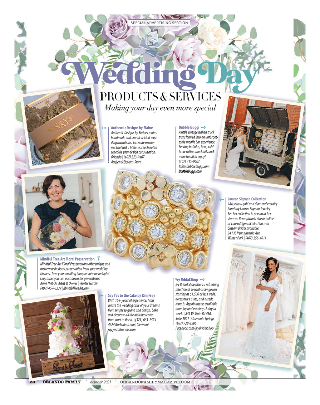 WeddingGuide - v3 - FINAL_Dept 9 / 27 / 21 4 : 30 PM Page 1 SPECIAL ADVERTISING SECTION ? e ? di ? g ? a ? PRODUCTS & SERVICES Making your day even more special ? Bubble Buggi Authentic Designs by Elaine ? A little vintage Italian truck Authentic Designs by Elaine creates transformed into an unforget - handmade and one - of - a - kind wed - table mobile bar experience . ding invitations . To create memo - Serving bubbles , beer , cold ries that last a lifetime , reach out to brew coffee , mocktails and schedule your design consultation . more for all to enjoy ! Orlando | ( 407 ) 223 - 9407 ( 407 ) 415 - 9507 AuthenticDesigns.Store Info @ BubbleBuggi.com BubbleBuggi.com ? Lauren Sigman Collection 18K yellow gold and diamond eternity bands by Lauren Sigman Jewelry . See her collection in person at her store on Pennsylvania Ave or online at LaurenSigmanCollection.com Custom Bridal available . 341 N . Pennsylvania Ave . Winter Park | ( 407 ) 256 - 4011 Mindful Tree Art Floral Preservation ? Mindful Tree Art Floral Preservations offer unique and modern resin floral preservation from your wedding flowers . Turn your wedding bouquet into meaningful keepsakes you can pass down for generations ! Ivy Bridal Shop ? Anne Niebch , Artist & Owner | Winter Garden Ivy Bridal Shop offers a refreshing ( 407 ) 457 - 0239 | MindfulTreeArt.com selection of special - order gowns ? starting at $ 1,500 or less , veils , Say Yes to the Cake by Kim Frey accessories , suits , and tuxedo With 16 + years of experience , I can rentals . Appointments available create the wedding cake of your dreams morning and evenings 7 days a from simple to grand and design , bake week . | 851 W State Rd 436 , and decorate all the delicious cakes Suite 1001 | Altamonte Springs from start to finish . | ( 321 ) 663 - 7574 ( 407 ) 728 - 8506 4624 Barbados Loop | Clermont Facebook.com / IvyBridalShop sayyestothecake.com 56 ORLANDO FAMILY october 2021 ORLANDOFAMILYMAGAZINE.COM