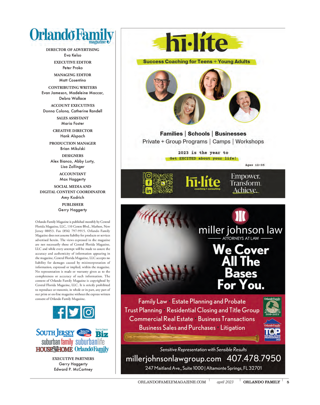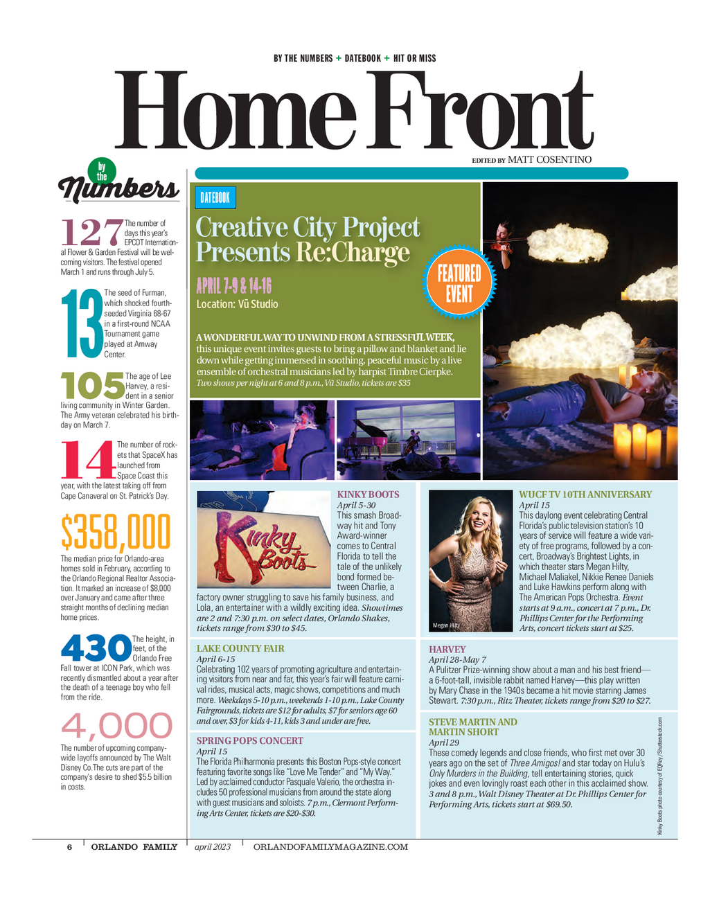 OFM_HomeFront_0423_Layout 1 3 / 21 / 23 1 : 11 PM Page 1 + + BY THE NUMBERS DATEBOOK HIT OR MISS EDITED BY MATT COSENTINO DATEBOOK The number of days this year’s Creative City Project 127EPCOT Internation - al Flower & Garden Festival will be wel - Presents Re:Charge coming visitors . The festival opened March 1 and runs through July 5 . APRIL 7 - 9 & 14 - 16 The seed of Furman , - which shocked fourth - Location : Vu Studio seeded Virginia 68 - 67 in a first - round NCAA Tournament game AWONDERFUL WAY TO UNWIND FROM A STRESSFUL WEEK , played at Amway this unique event invites guests to bring a pillow and blanket and lie 13Center . downwhile getting immersed in soothing , peaceful music by a live ensemble of orchestral musicians led by harpist Timbre Cierpke . The age of Lee - Twoshowsper night at 6 and 8 p.m . , Vu Studio , tickets are $ 35 Harvey , a resi - 105dent in a senior living community in Winter Garden . The Army veteran celebrated his birth - day on March 7 . The number of rock - ets that SpaceX has launched from 14Space Coast this year , with the latest taking off from KINKY BOOTS WUCF TV 10TH ANNIVERSARY Cape Canaveral on St . Patrick’s Day . April 5 - 30 April 15 This smash Broad - This daylong event celebrating Central way hit and Tony Florida’s public television station’s 10 Award - winner years of service will feature a wide vari - $ 358,000 comes to Central ety of free programs , followed by a con - Florida to tell the cert , Broadway’s Brightest Lights , in The median price for Orlando - area tale of the unlikely which theater stars Megan Hilty , homes sold in February , according to bond formed be - Michael Maliakel , Nikkie Renee Daniels the Orlando Regional Realtor Associa - tween Charlie , a and Luke Hawkins perform along with tion . It marked an increase of $ 8,000 factory owner struggling to save his family business , and The American Pops Orchestra . Event over January and came after three straight months of declining median Lola , an entertainer with a wildly exciting idea . Showtimes startsat 9 a.m . , concert at 7 p.m . , Dr . home prices . are 2 and 7 : 30 p.m . on select dates , Orlando Shakes , PhillipsCenter for the Performing Megan Hilty tickets range from $ 30 to $ 45 . Arts , concert tickets start at $ 25 . The height , in feet , of the LAKE COUNTY FAIR HARVEY 430Orlando Free April 6 - 15 April 28 - May 7 Fall tower at ICON Park , which was Celebrating 102 years of promoting agriculture and entertain - A Pulitzer Prize - winning show about a man and his best friend — recently dismantled about a year after ing visitors from near and far , this year’s fair will feature carni - a 6 - foot - tall , invisible rabbit named Harvey — this play written the death of a teenage boy who fell val rides , musical acts , magic shows , competitions and much by Mary Chase in the 1940s became a hit movie starring James from the ride . more . Weekdays5 - 10 p.m . , weekends 1 - 10 p.m . , Lake County Stewart . 7 : 30p.m . , Ritz Theater , tickets range from $ 20 to $ 27 . Fairgrounds , tickets are $ 12 for adults , $ 7 for seniors age 60 m andover , $ 3 for kids 4 - 11 , kids 3 and under are free . o STEVE MARTIN AND ock.c MARTIN SHORT terst 4,000 SPRING POPS CONCERT ut April 29 The number of upcoming company - Sh April 15 These comedy legends and close friends , who first met over 30 / y wide layoffs announced by The Walt o The Florida Philharmonia presents this Boston Pops - style concert R years ago on the set of Three Amigos ! and star today on Hulu’s Q Disney Co.The cuts are part of the E f featuring favorite songs like “ Love Me Tender ” and “ My Way . ” Only Murders in the Building , tell entertaining stories , quick o company's desire to shed $ 5.5 billion esy Led by acclaimed conductor Pasquale Valerio , the orchestra in - t jokes and even lovingly roast each other in this acclaimed show . our in costs . cludes 50 professional musicians from around the state along c 3and 8 p.m . , Walt Disney Theater at Dr . Phillips Center for oto with guest musicians and soloists . 7 p.m . , Clermont Perform - h Performing Arts , tickets start at $ 69.50 . p ts ingArts Center , tickets are $ 20 - $ 30 . Boo Kinky 6 ORLANDO FAMILY april 2023 ORLANDOFAMILYMAGAZINE.COM