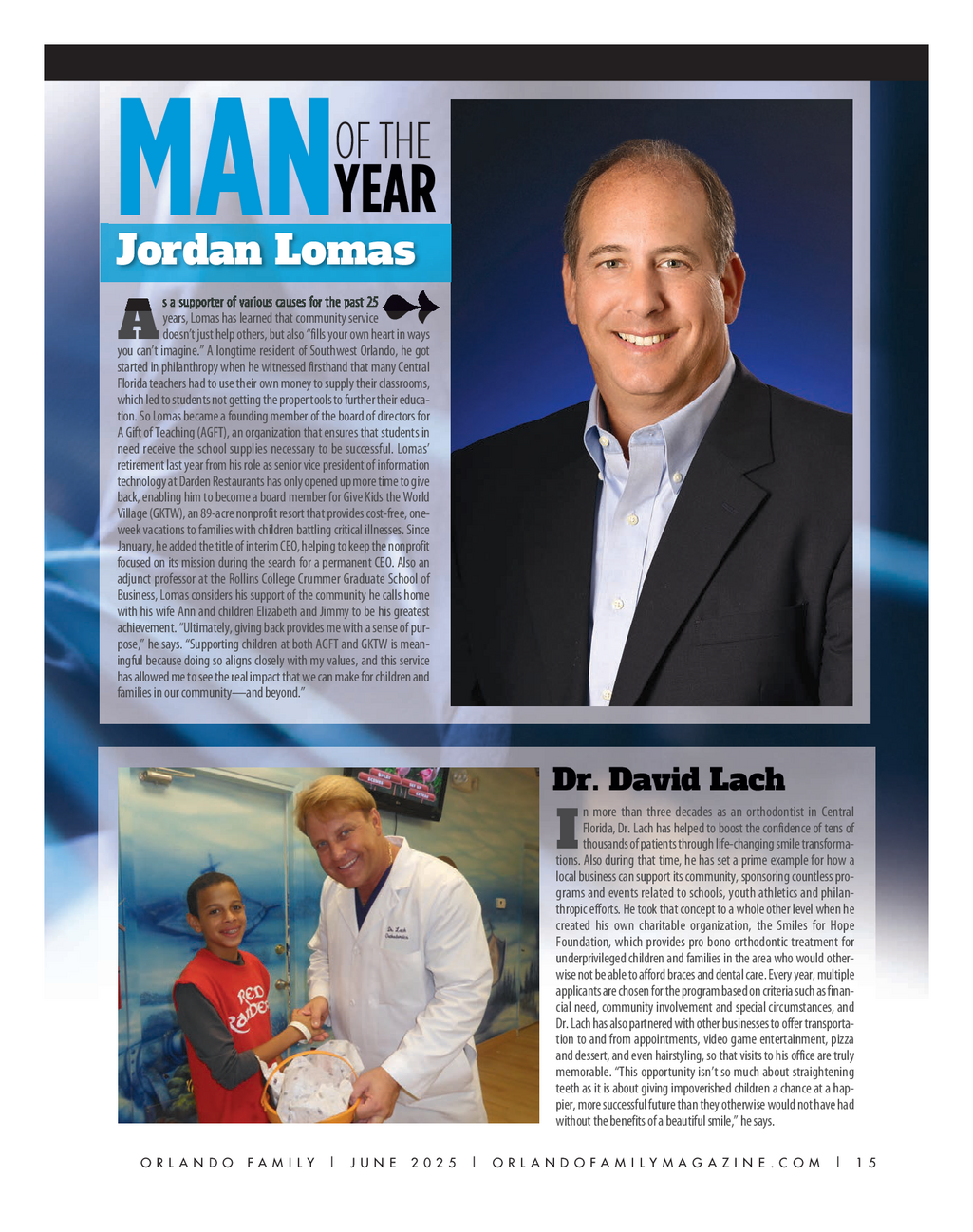 OFM_Men of the Year_0625FINAL.qxp_Pages 5 / 8 / 25 1 : 38 PM Page 2 OF THE YEAR MAN Jordan Lomas s a supporter of various causes for the past 25 years , Lomas has learned that community service ? A doesn’tjust help others , but also “ fills your own heart in ways you can’t imagine . ” A longtime resident of Southwest Orlando , he got started in philanthropy when he witnessed firsthand that many Central Florida teachers had to use their own money to supply their classrooms , which led to students not getting the proper tools to further their educa - tion . So Lomas became a founding member of the board of directors for A Gift of Teaching ( AGFT ) , an organization that ensures that students in need receive the school supplies necessary to be successful . Lomas ’ retirement last year from his role as senior vice president of information technology at Darden Restaurants has only opened up more time to give back , enabling him to become a board member for Give Kids the World Village ( GKTW ) , an 89 - acre nonprofit resort that provides cost - free , one - week vacations to families with children battling critical illnesses . Since January , he added the title of interim CEO , helping to keep the nonprofit focused on its mission during the search for a permanent CEO . Also an adjunct professor at the Rollins College Crummer Graduate School of Business , Lomas considers his support of the community he calls home with his wife Ann and children Elizabeth and Jimmy to be his greatest achievement . “ Ultimately , giving back provides me with a sense of pur - pose , ” he says . “ Supporting children at both AGFT and GKTW is mean - ingful because doing so aligns closely with my values , and this service has allowed me to see the real impact that we can make for children and families in our community — and beyond . ” Dr . David Lach n more than three decades as an orthodontist in Central Florida , Dr . Lach has helped to boost the confidence of tens of I thousands of patients through life - changing smile transforma - tions . Also during that time , he has set a prime example for how a local business can support its community , sponsoring countless pro - grams and events related to schools , youth athletics and philan - thropic efforts . He took that concept to a whole other level when he created his own charitable organization , the Smiles for Hope Foundation , which provides pro bono orthodontic treatment for underprivileged children and families in the area who would other - wise not be able to afford braces and dental care . Every year , multiple applicants are chosen for the program based on criteria such as finan - cial need , community involvement and special circumstances , and Dr . Lach has also partnered with other businesses to offer transporta - tion to and from appointments , video game entertainment , pizza and dessert , and even hairstyling , so that visits to his office are truly memorable . “ This opportunity isn’t so much about straightening teeth as it is about giving impoverished children a chance at a hap - pier , more successful future than they otherwise would not have had without the benefits of a beautiful smile , ” he says . O R L A N D O F A M I L Y | J U N E 2 0 2 5 | O R L A N D O F A M I L Y M A G A Z I N E . C O M | 1 5